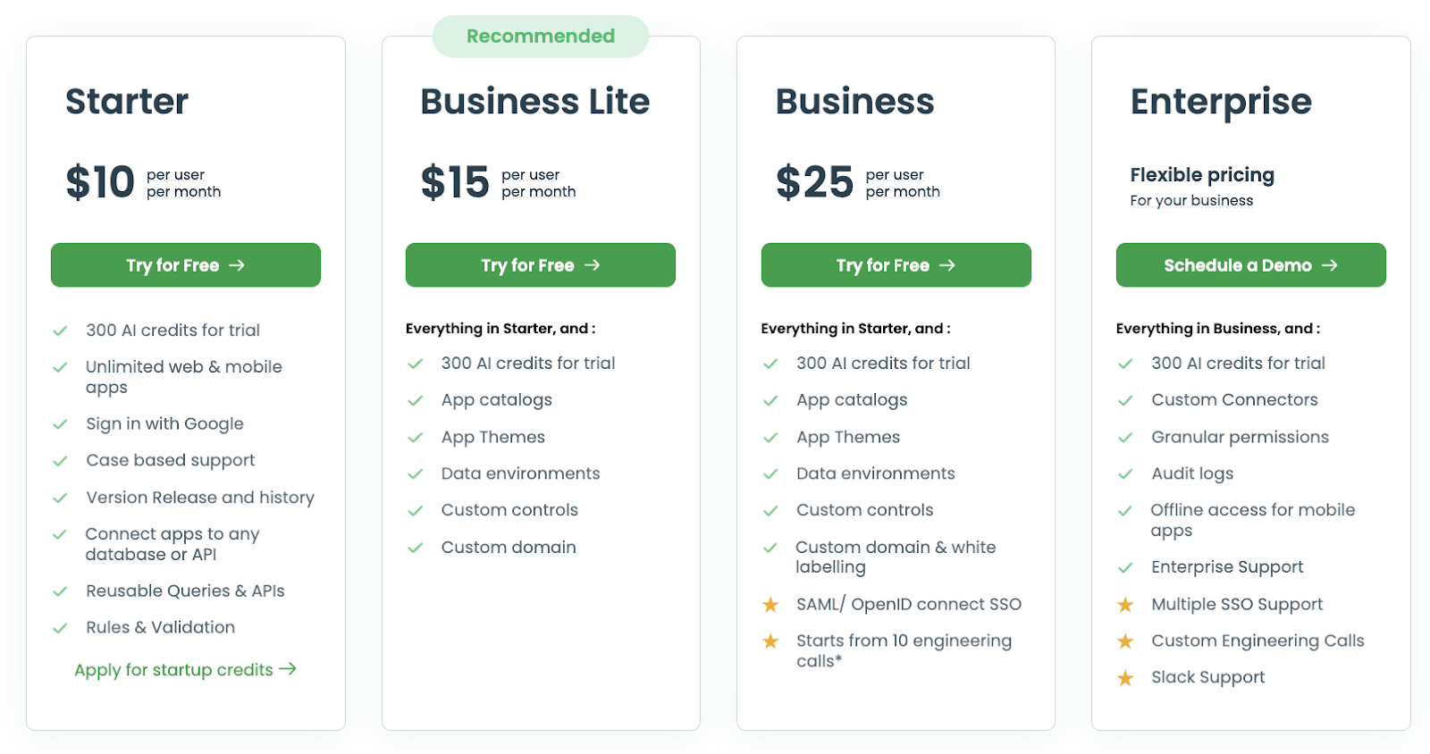 The Starter plan delivers solid value for small teams with access to unlimited apps, data connectors, and API capabilities. Business Lite and Business plans offer brand control, better environments, and SSO as your organization scales.