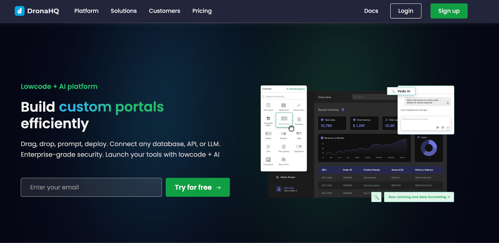 DronaHQ is a low-code platform for building internal tools, web apps, and mobile apps using drag-and-drop components, prebuilt templates, and powerful data integrations. It supports API connections, database integrations, AI automation, and secure user management, all wrapped into a user-friendly interface.