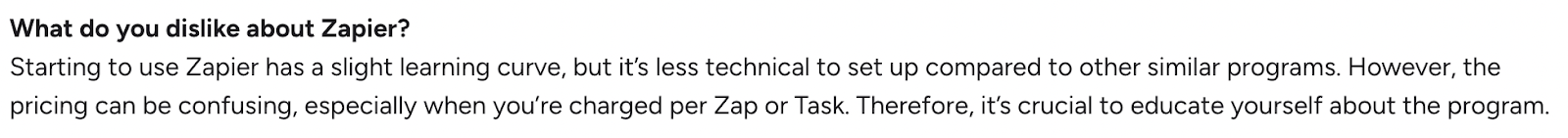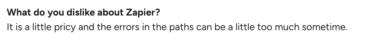 According to aggregated G2 user reviews, “Expensive” was the most cited con for Zapier, appearing 75 times, followed closely by mentions of pricing issues (56 times). Users commonly highlight how costs escalate as needs grow.
